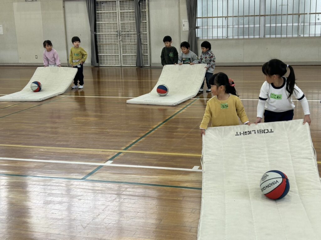 童子山小学校の体育館でのびのびと運動遊びをしながら、少しずつ大人の手を離れて一人で運動ができるように促します。