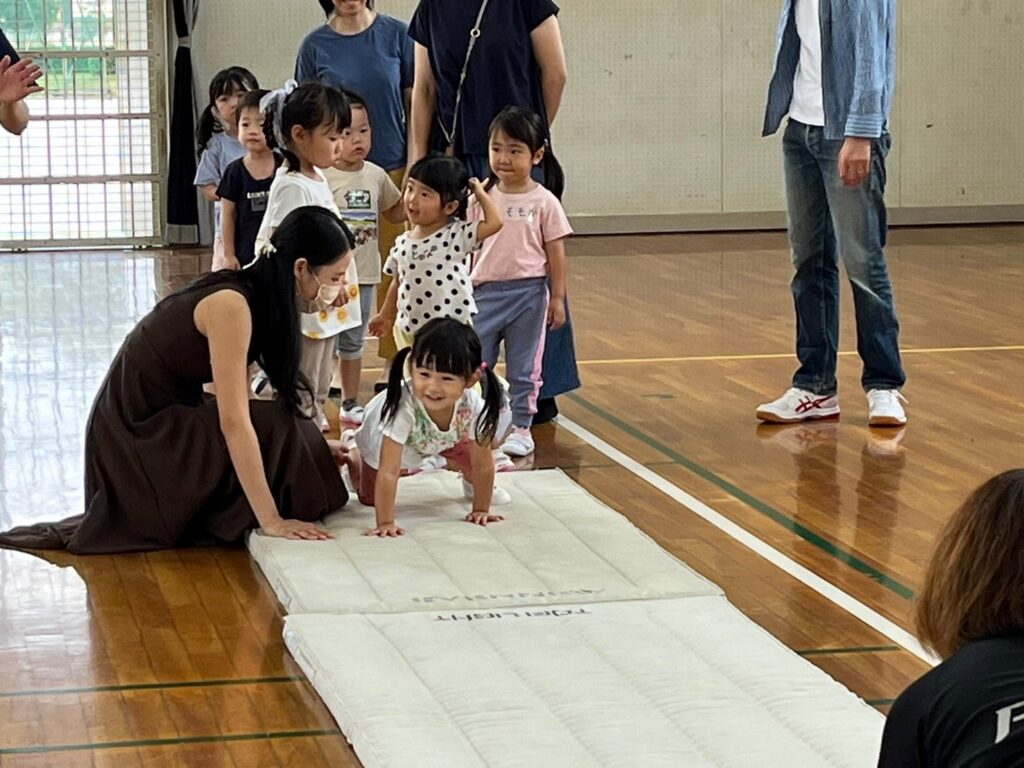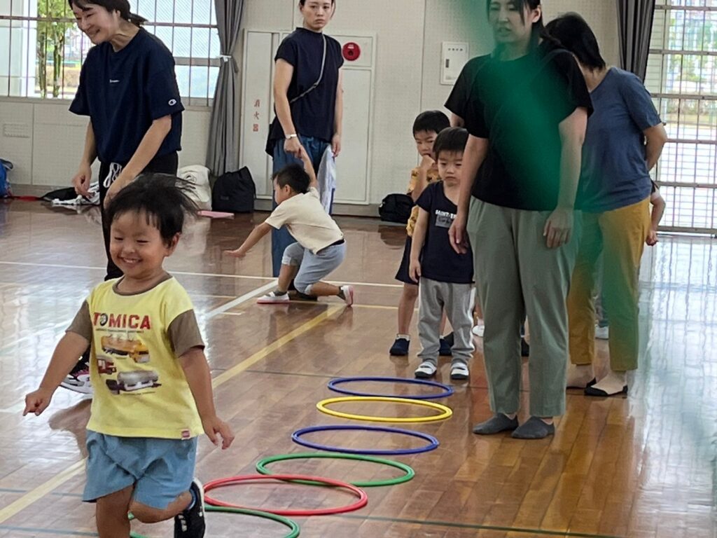 童子山小学校の体育館でのびのびと運動遊びをしながら、少しずつ大人の手を離れて一人で運動ができるように促します。